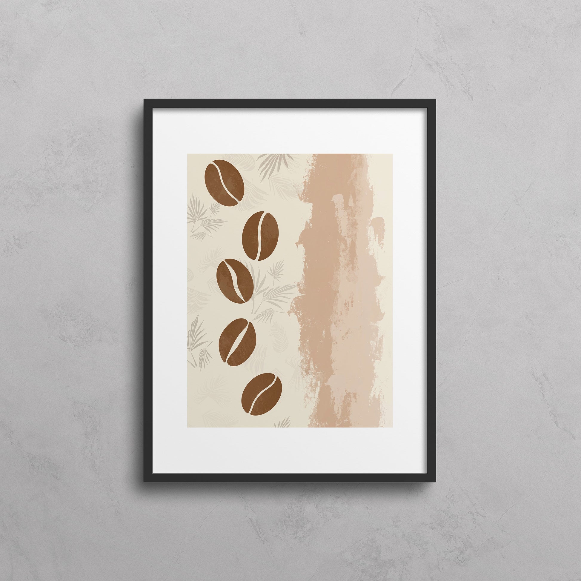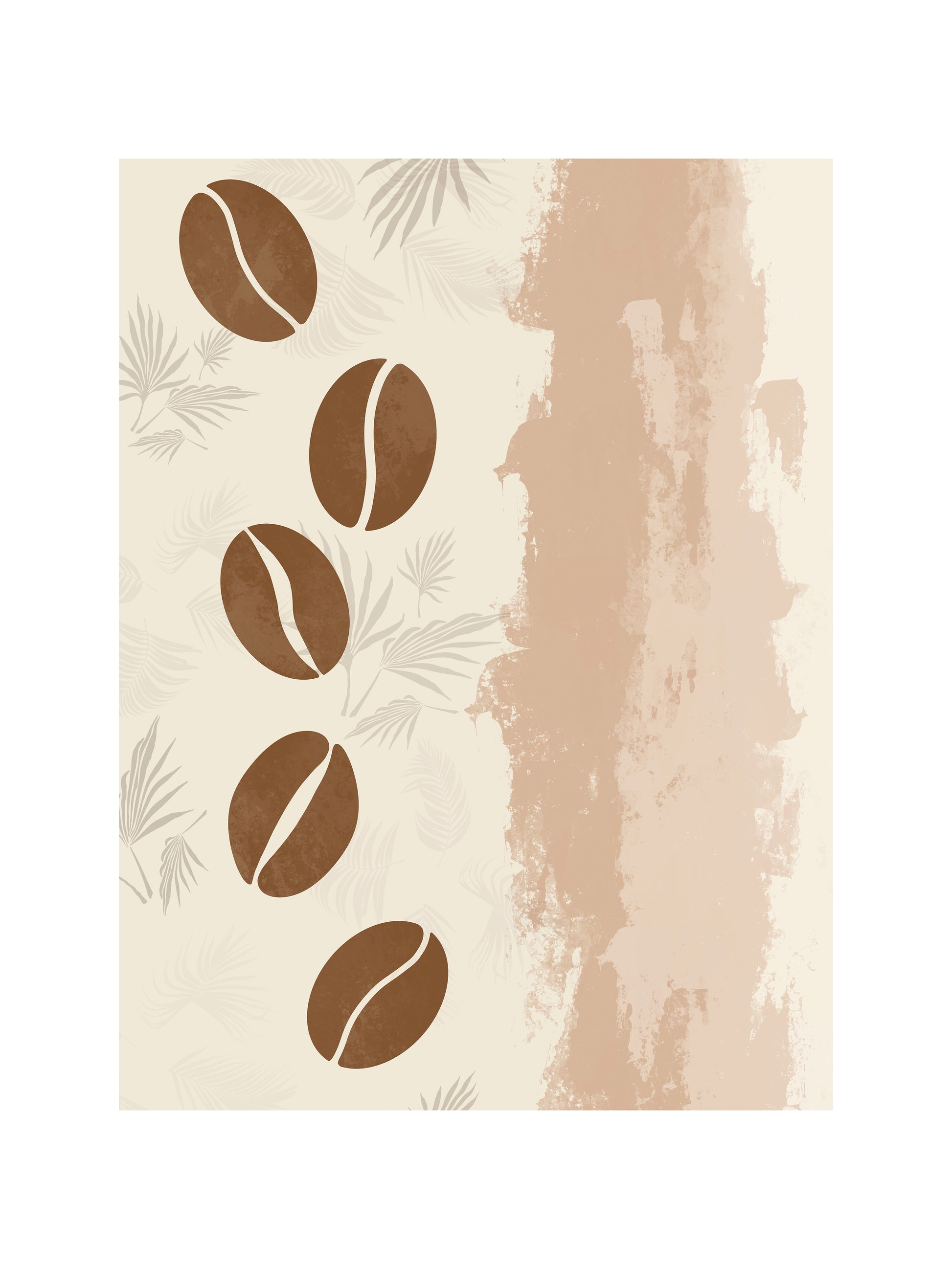 Celebrate the beauty of simplicity with "BEANS", a warm and earthy tribute to the humble coffee bean. Featuring stylized coffee beans cascading across a textured cream and taupe backdrop, this art print combines natural tones with subtle botanical patterns to create a balanced and soothing composition. The organic feel and painterly wash on the right side add depth and warmth, making this piece perfect for kitchens, cafés, or any cozy corner.