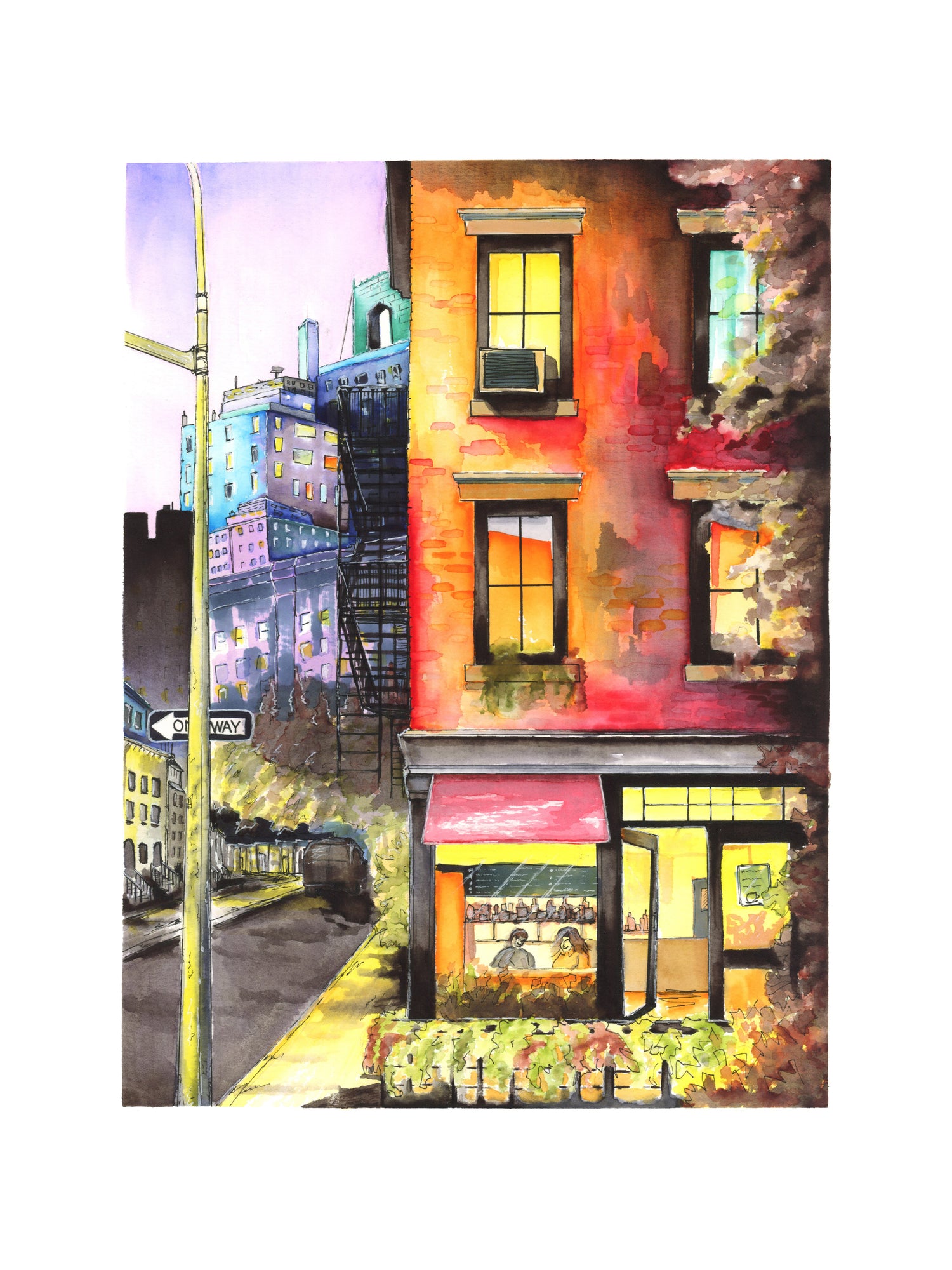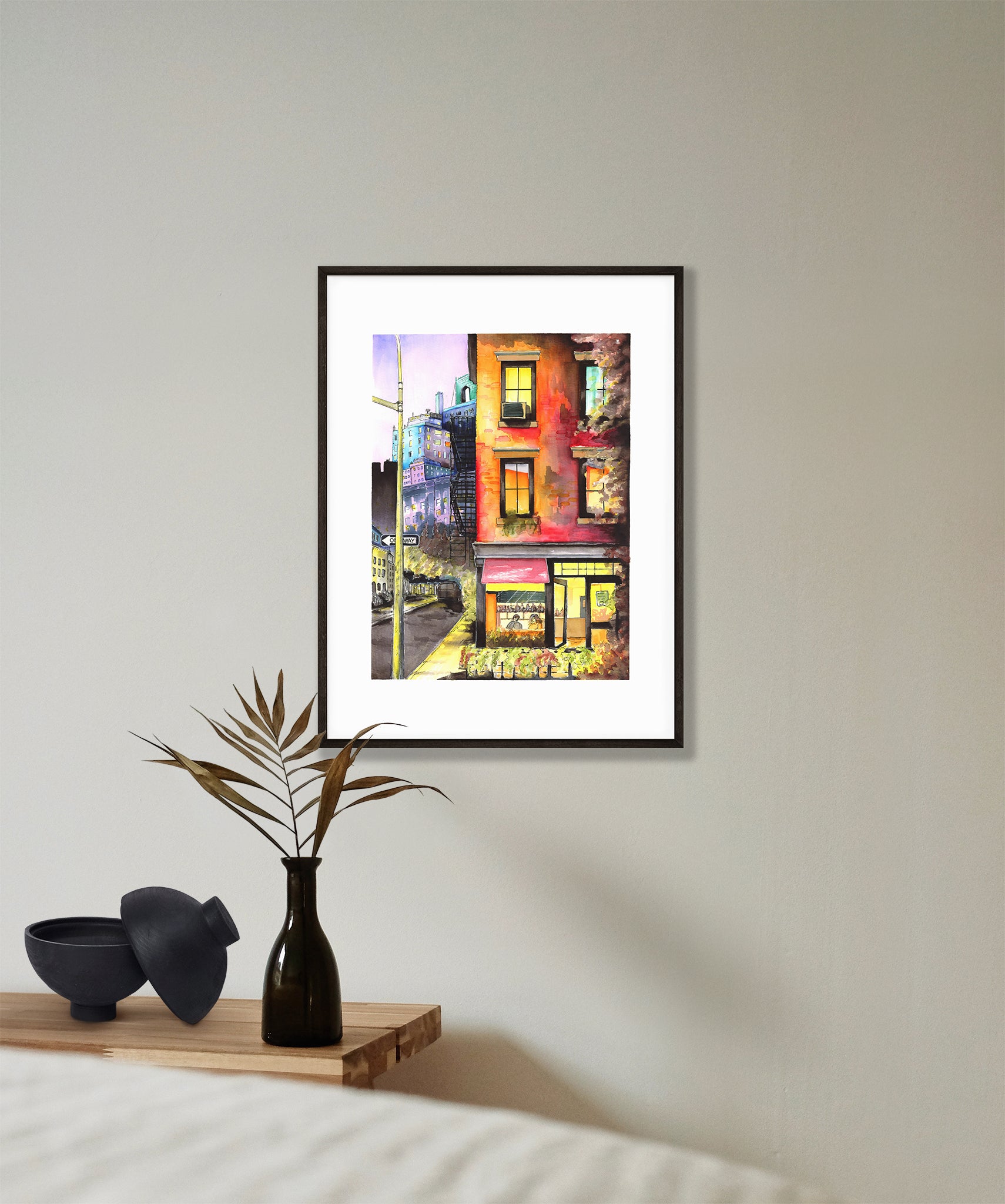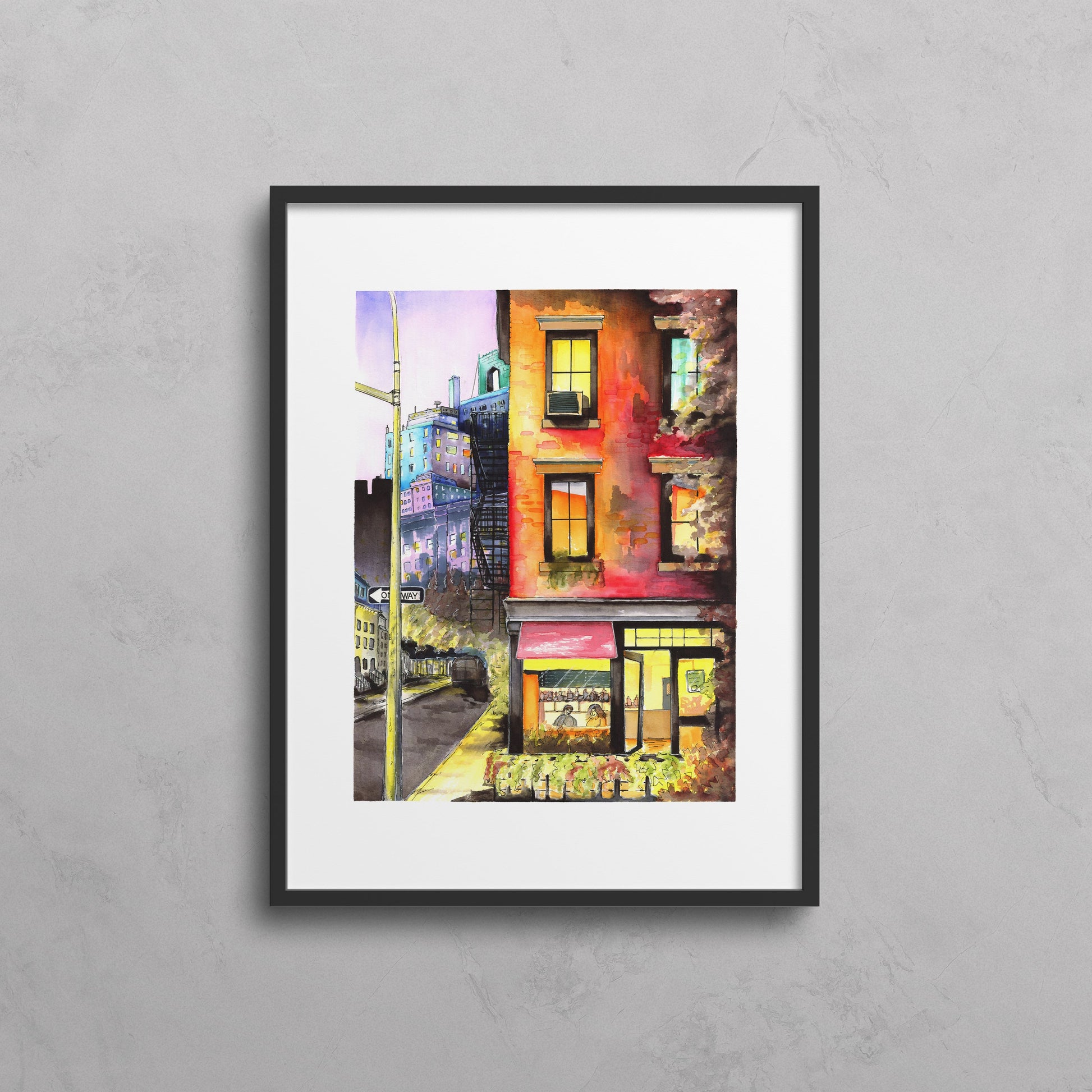 Step into the charm of a quiet city evening with "GREENWICH", a richly detailed watercolor art print that captures the warm, lived-in character of an urban corner café. Inspired by the iconic architecture and ambiance of New York’s Greenwich Village, this piece invites you to linger in the golden glow of streetlights and windowpanes, where stories unfold behind every window.