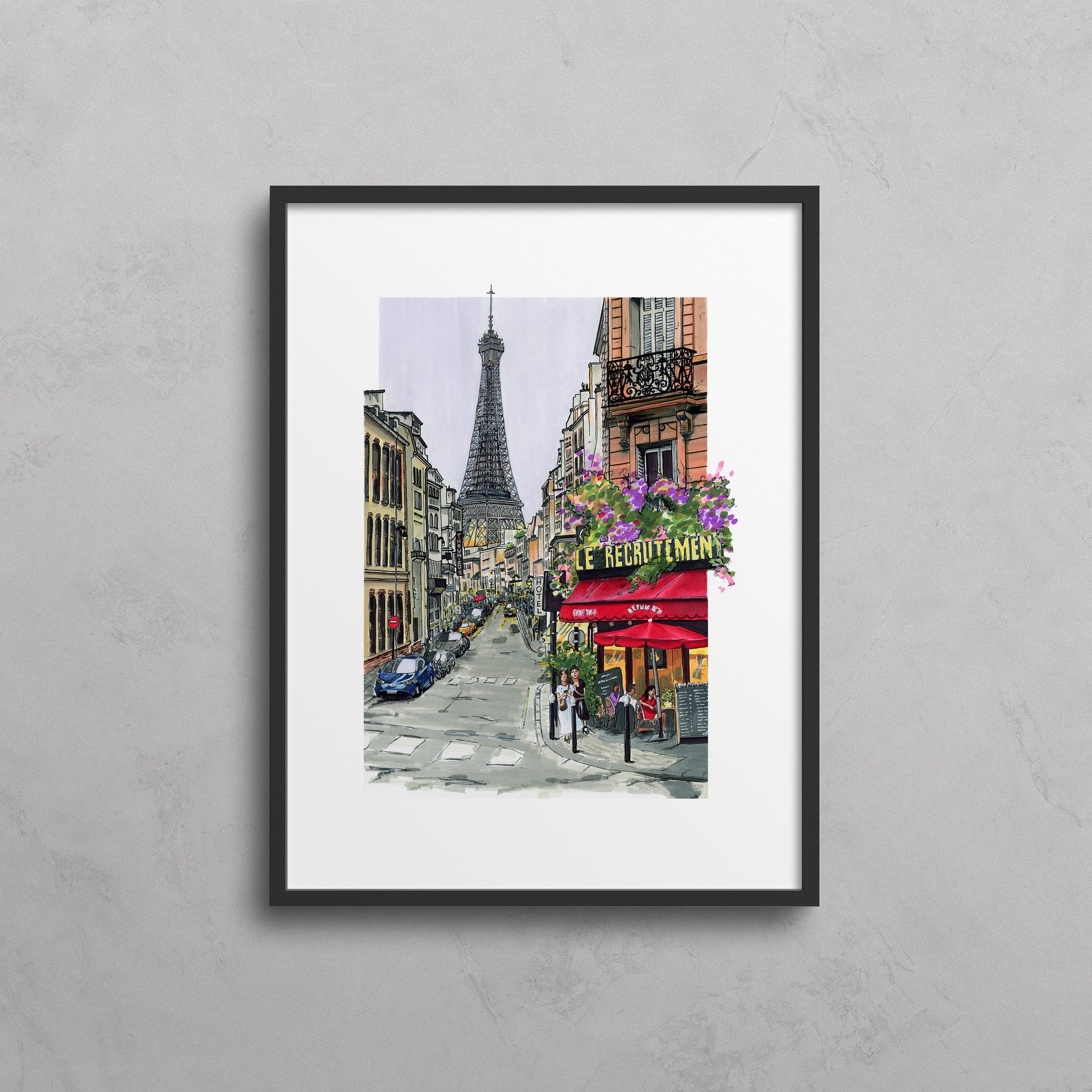 "PARIS" is a window into a classic Parisian moment. A bustling café scene set against the quiet grandeur of the Eiffel Tower. From the red awning of Le Recrutement Café to the cobblestone street lined with diners, and timeless architecture, this hand-drawn piece captures the soul of the City of Light. The tower rises in the distance, framed perfectly by the charm of everyday life unfolding below.